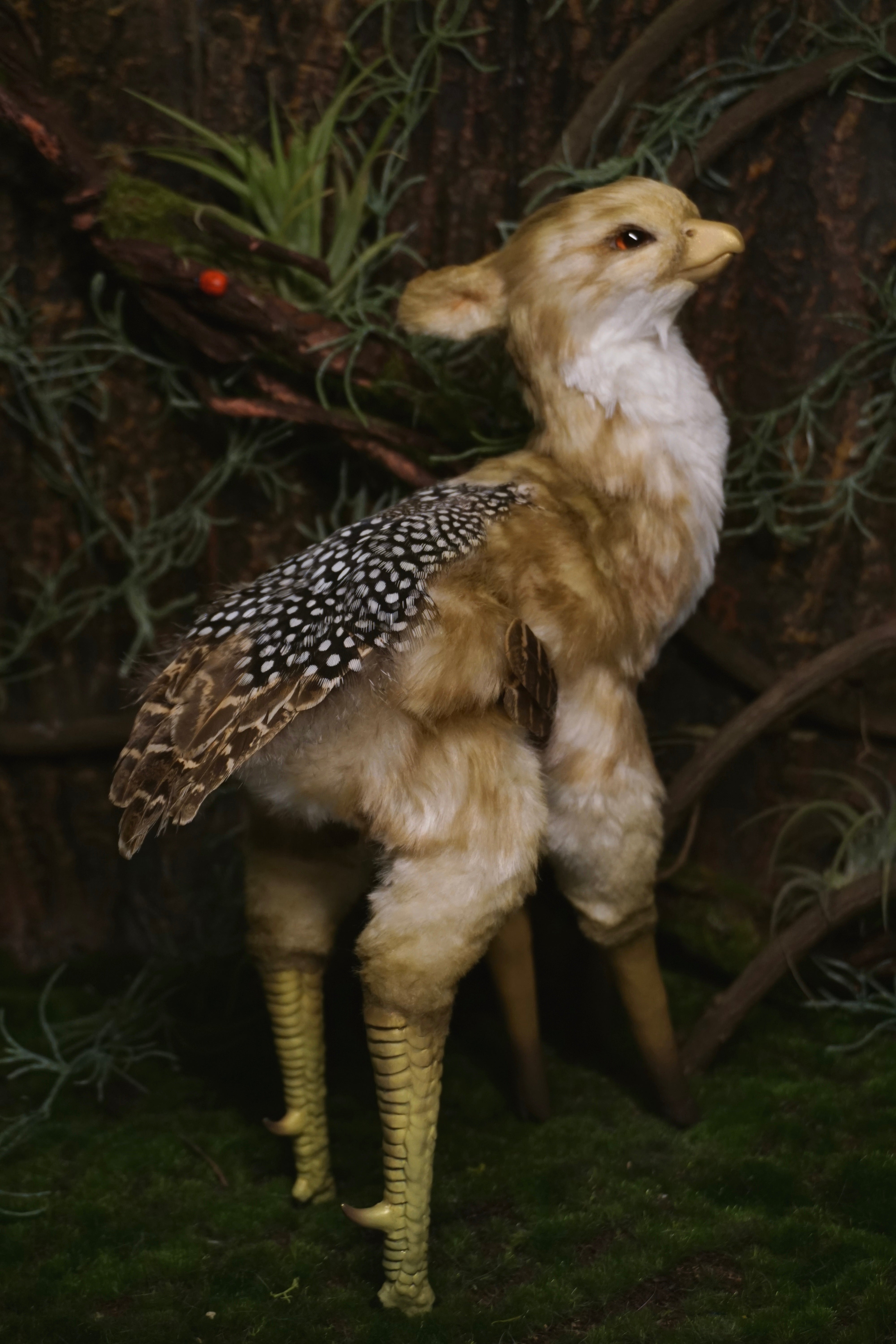 Materials: The creature is crafted using a combination of faux rabbit fur, American clay for the core structure, aluminum wire for poseable joints, delicate glass for the eyes, and real feathers for detailed wing texture.